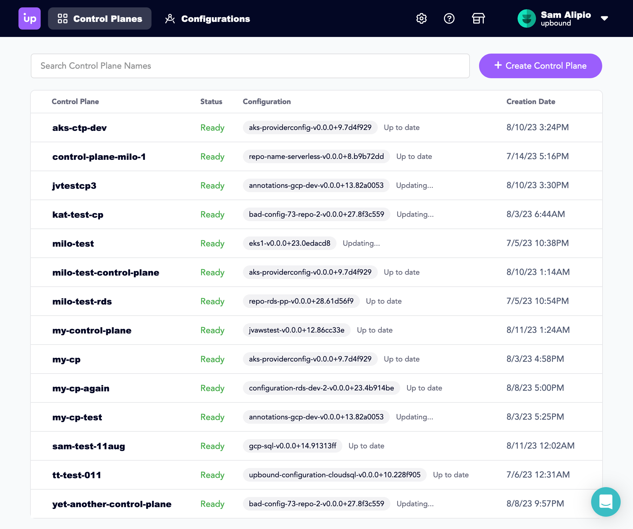 The default landing page for the Console is the control plane dashboard. On the dashboard is a table view of your managed control planes showing key details such as name, status, configuration version, and creation date. You can search the table by control plane name to filter down the table.