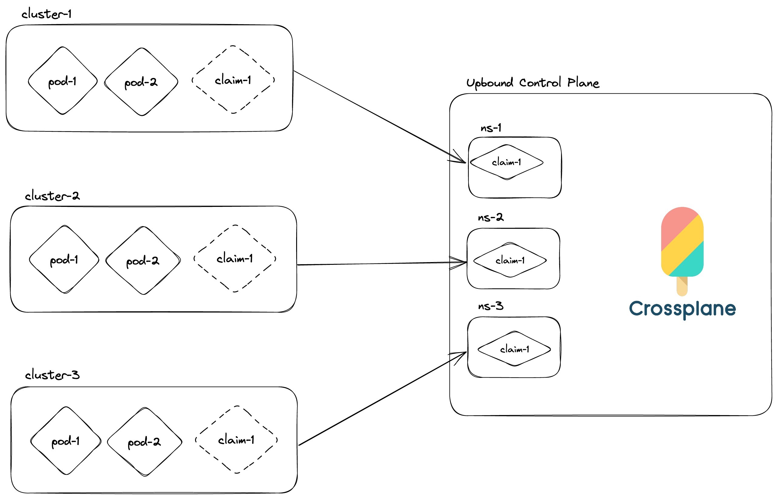 Claims are store in a unique namespace in the Upbound managed control plane. Every cluster creates a new MCP namespace.