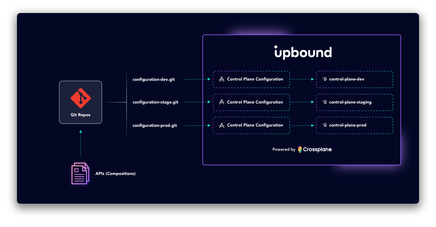 Configurations are a Crossplane package that bundles a set of API definitions. Every Crossplane Configuration in the Upbound environment has its source synced directly from a Git repository. Users choose from this selection of Configurations in their Upbound environment when they want to install a set of APIs on a managed control plane.