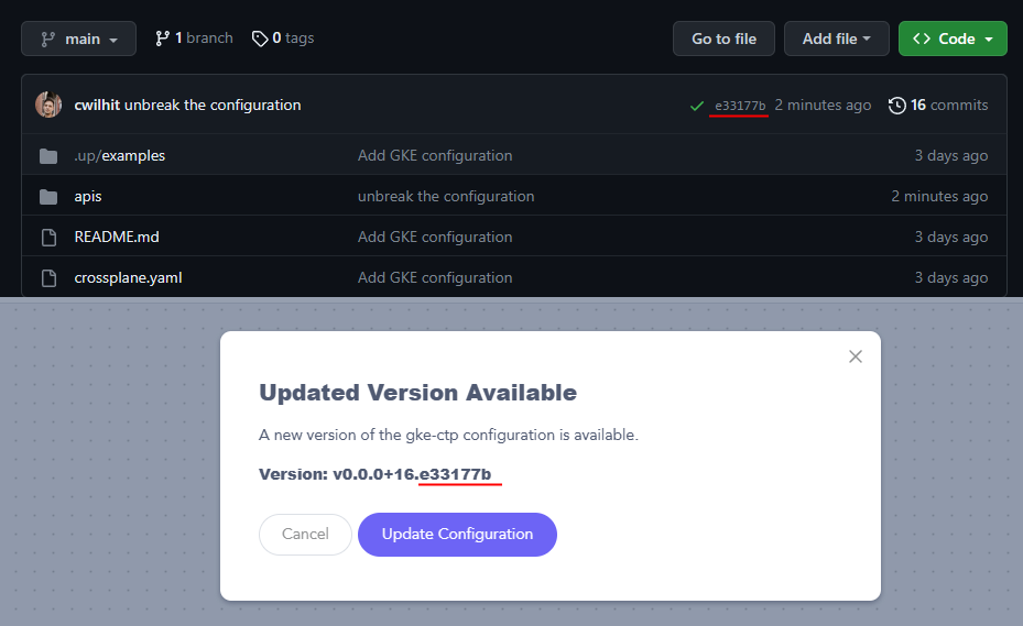 Upbound attempts to build a new version of your configuration for every commit to the main branch of the repository that backs your configuration. It’s your responsibility to push content to the repository which builds into a valid Crossplane configuration package.