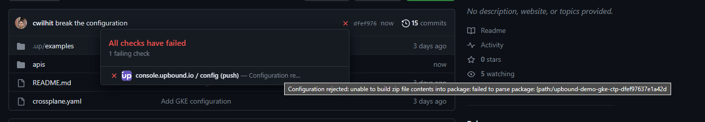 When the repository contents fail to build a configuration, the Upbound GitHub app reports a failure and brief message explaining why. Hover over the status text on GitHub to see the full message: