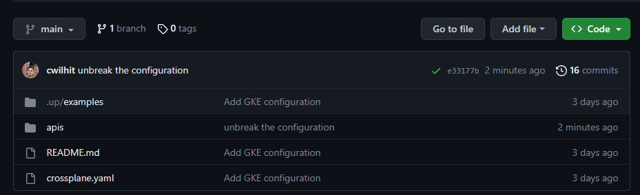 crossplane.yaml- this file is where you name your configuration, declare dependencies on Crossplane providers, and other Configurationsapisfolder - this folder is where you should define your XRDs and compositions..up/examplesfolder - this folder contains example claims that invoke APIs defined in the Configuration